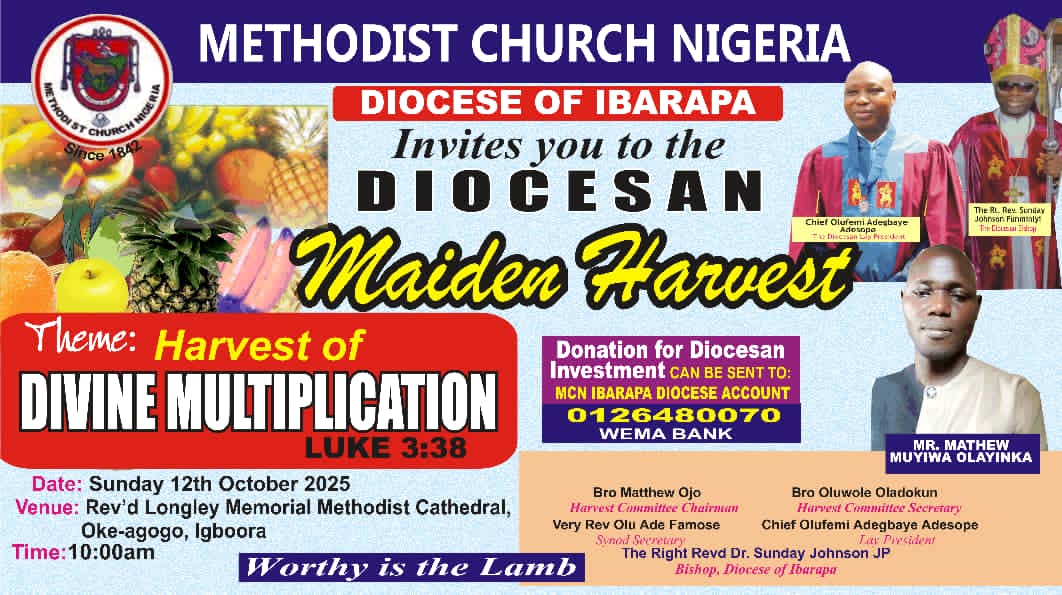 Methodist Church Nigeria, Diocese of Ibarapa is set to hold its Maiden Harvest Programme on Sunday, October 12, 2025, at Rev’d. Longley Memorial Methodist Cathedral, Igboora. The inaugural harvest, themed “Harvest of Divine Multiplication,” marks a season of gratitude and reflection on God’s provision since the Diocese’s inauguration in March 2025.